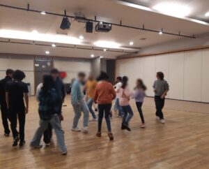 Exercice d’échauffement, de mise en voix ,d’improvisation et de mimes afin d’appréhender le temps fort 3, restitution des ateliers en classe le 22 mai 2026.